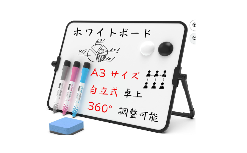 A3サイズで自立し、360度回転するので、思いついたアイデアをガシガシ書いて、不要になったらサッと消すことができます。